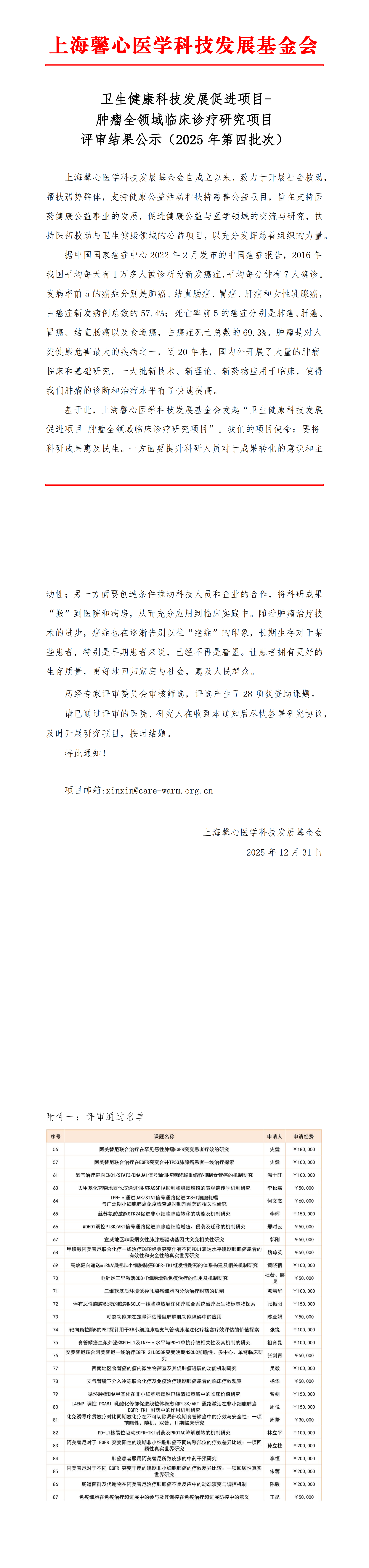 卫生健康科技发展促进项目—肿瘤全领域临床诊疗研究项目评审结果公示(2025年第四批次)